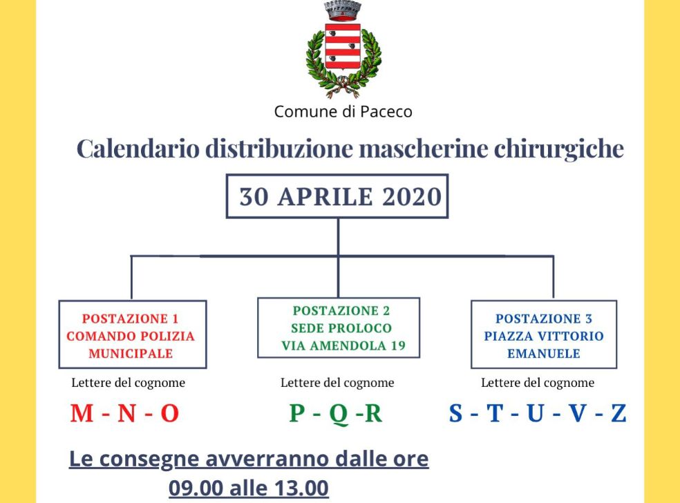 Da oggi e fino a domani giovedì 30 aprile 2020, le mascherine verranno consegnate ai cittadini attraverso tre punti di distribuzione allestiti in altrettanti locali comunali aperti dalle 9 alle 13, con rispettive giornate e lettere di riferimento: